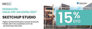 *Oferta de SketchUp Studio válida del 11 de noviembre al 2 de diciembre de 2022. Oferta disponible para todos los clientes nuevos y existentes de SketchUp Studio, pero solo se aplica a nuevas compras de SketchUp Studio y no está disponible en términos posteriores ni en suscripciones renovadas. El descuento sólo se aplica a un plazo de una suscripción a SketchUp Studio. Válido únicamente a través de revendedores participantes en Mexico. No aplica para pedidos realizados con anterioridad. No es válido para ningún caso de cumplimiento de licencia activo relacionado con Trimble Inc. No se puede combinar con otras ofertas. Pueden aplicarse otras restricciones. Aplica de 1 a 5 nuevas suscripciones.